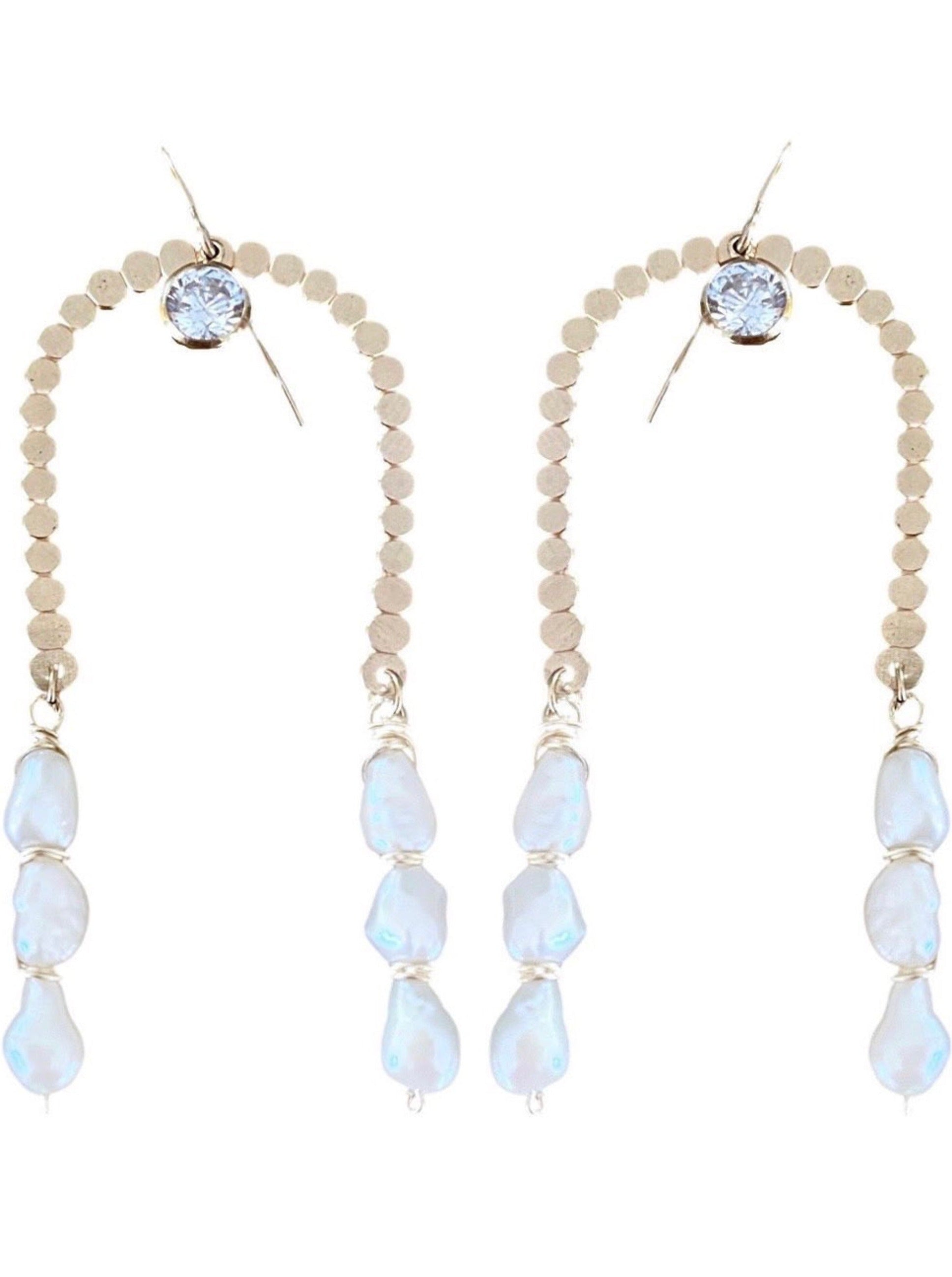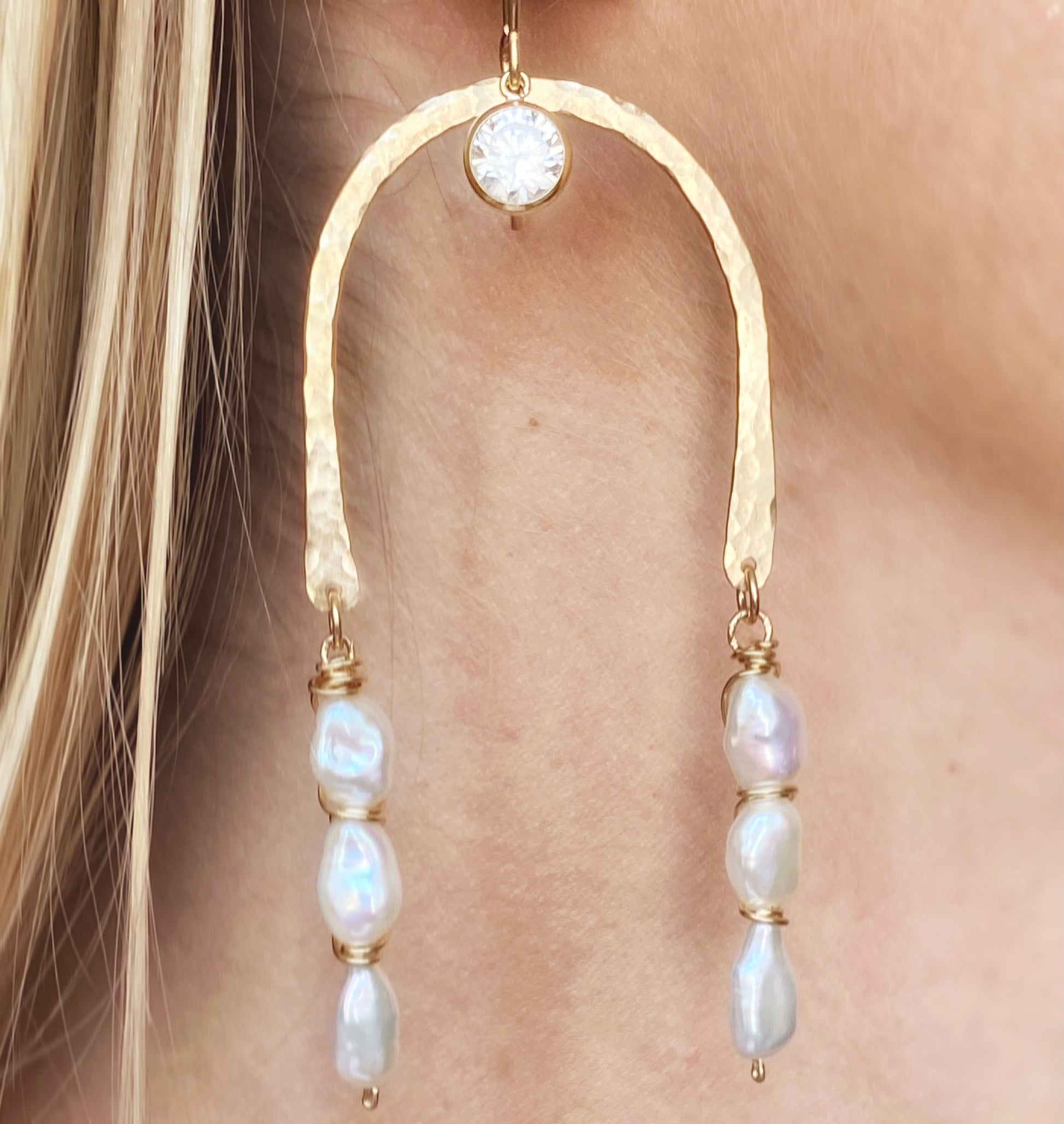 Hand forged from 14k gold-filled metal. Adorned with cubic zirconia and freshwater pearls.