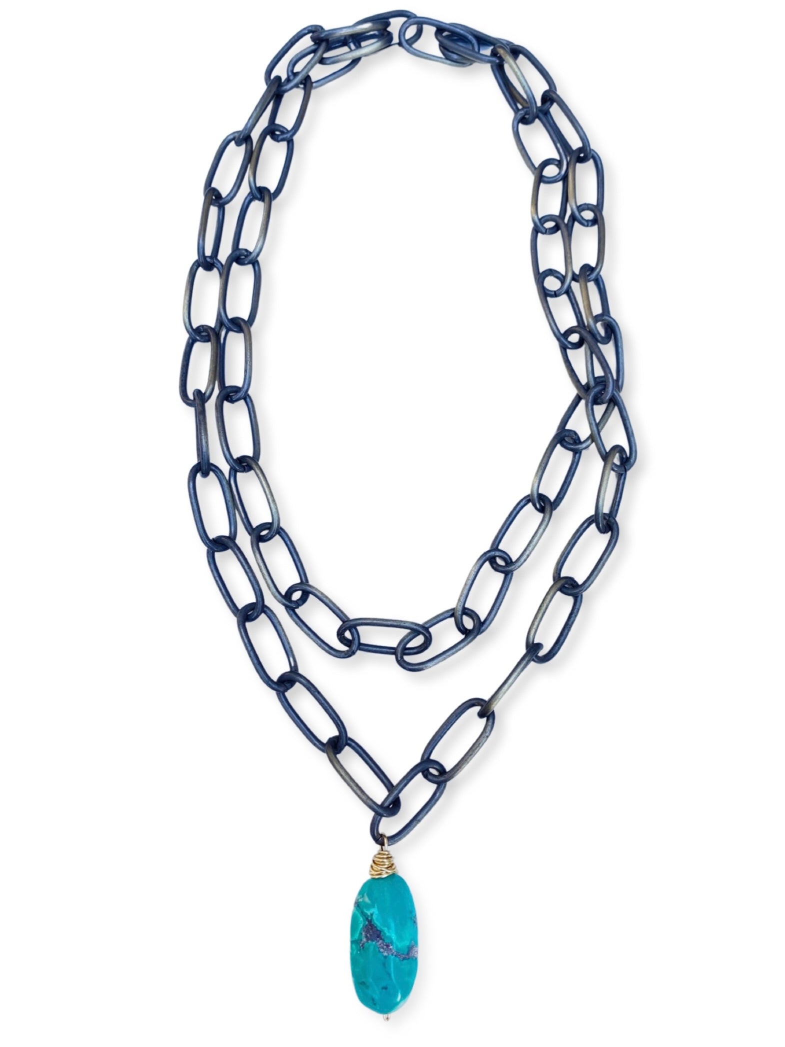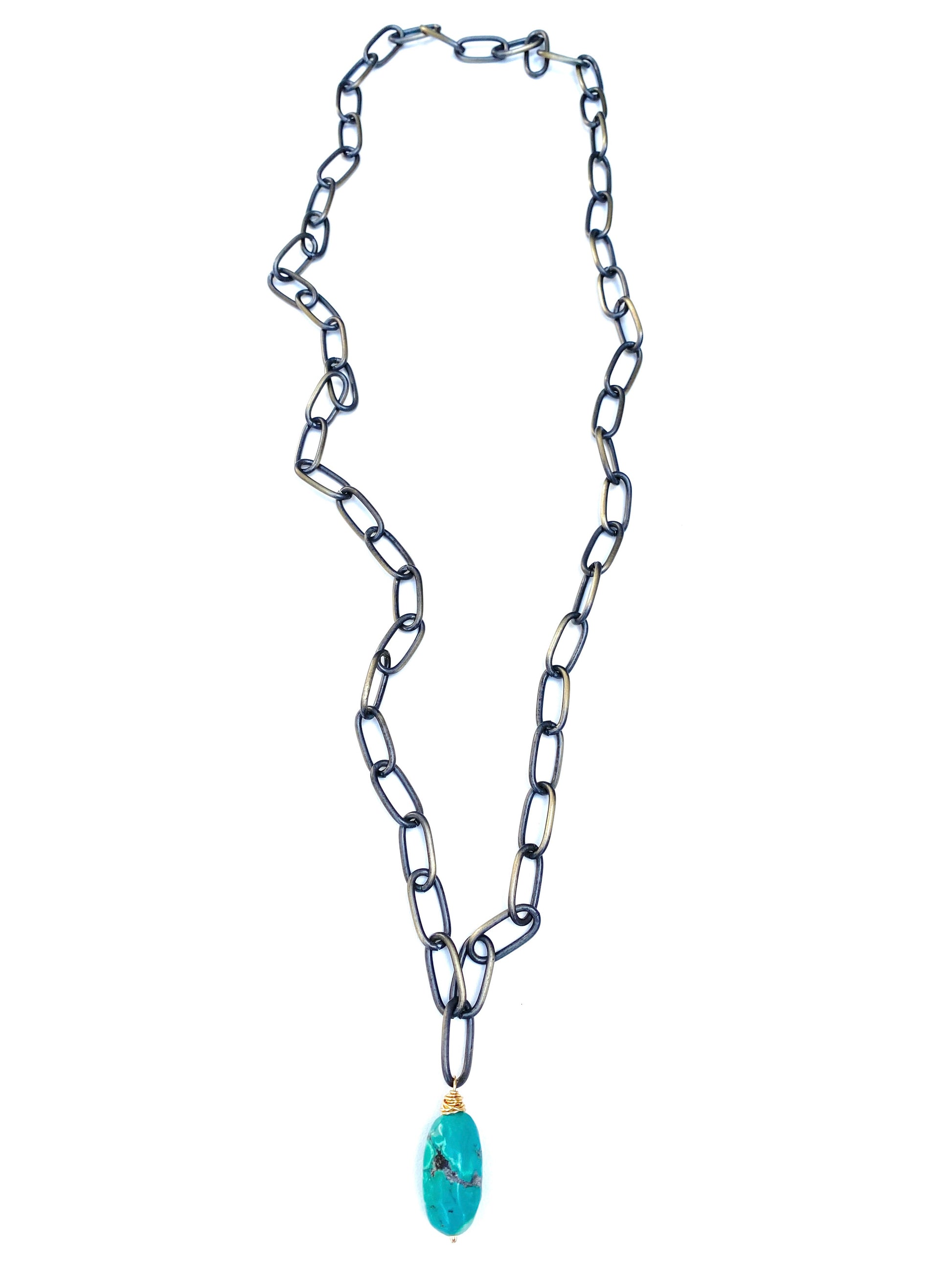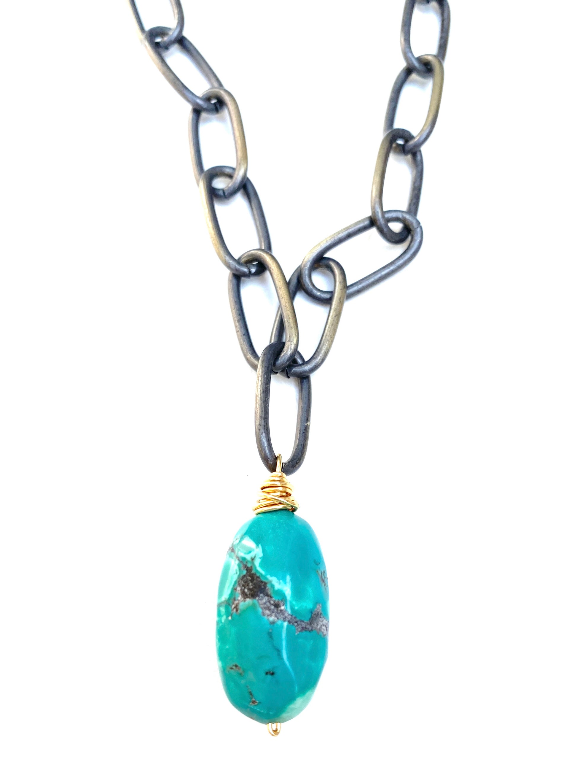 This show stopping necklace has antiqued brass chain with a gorgeous piece of turquoise.