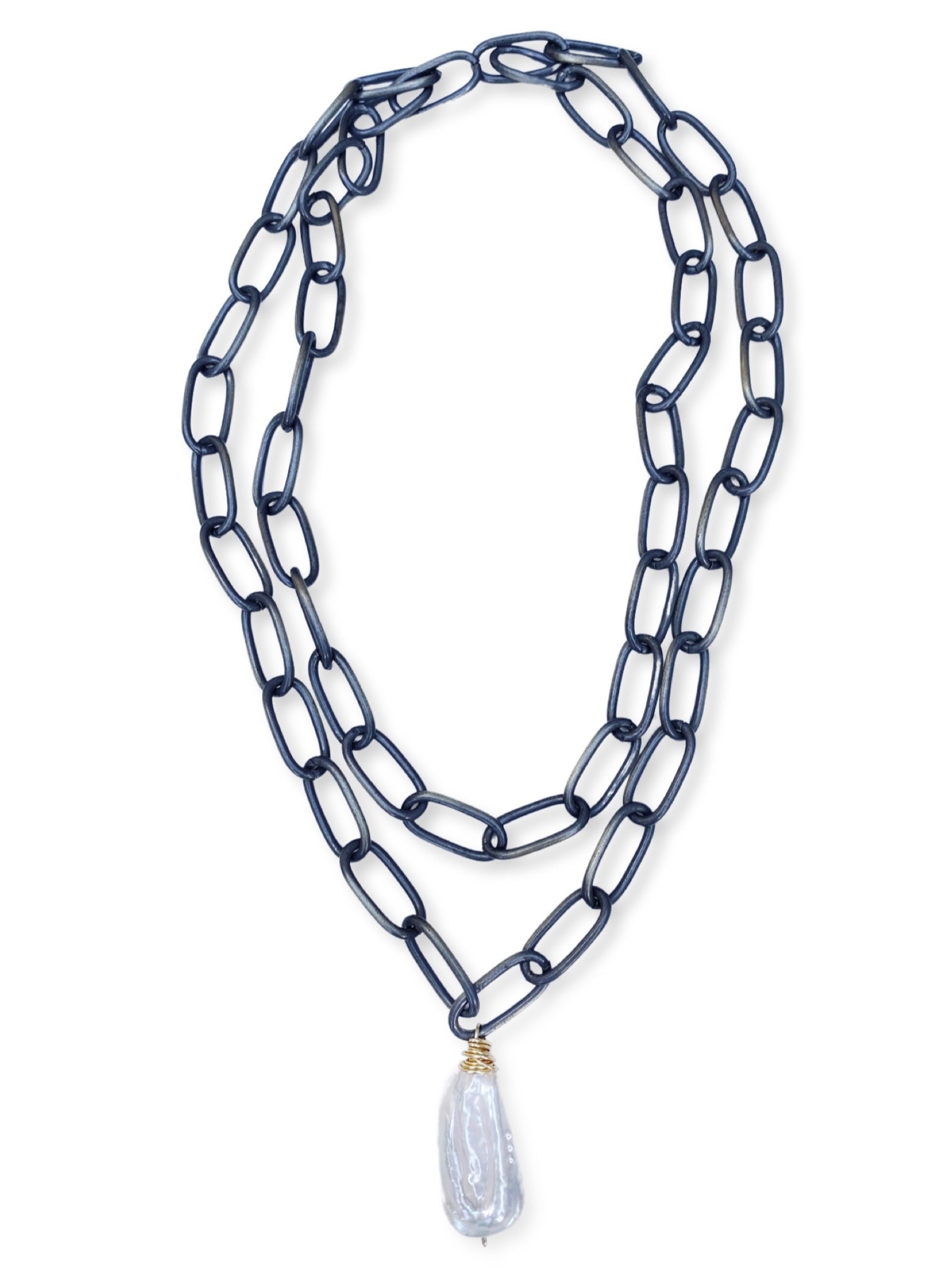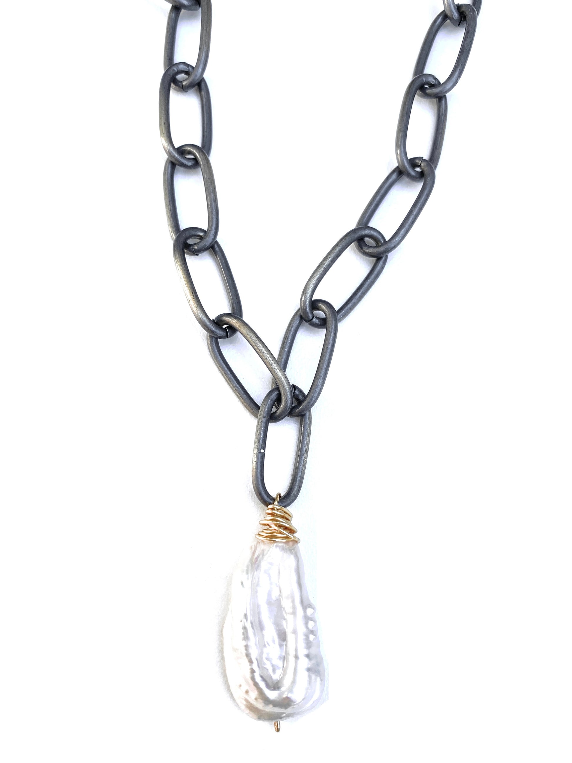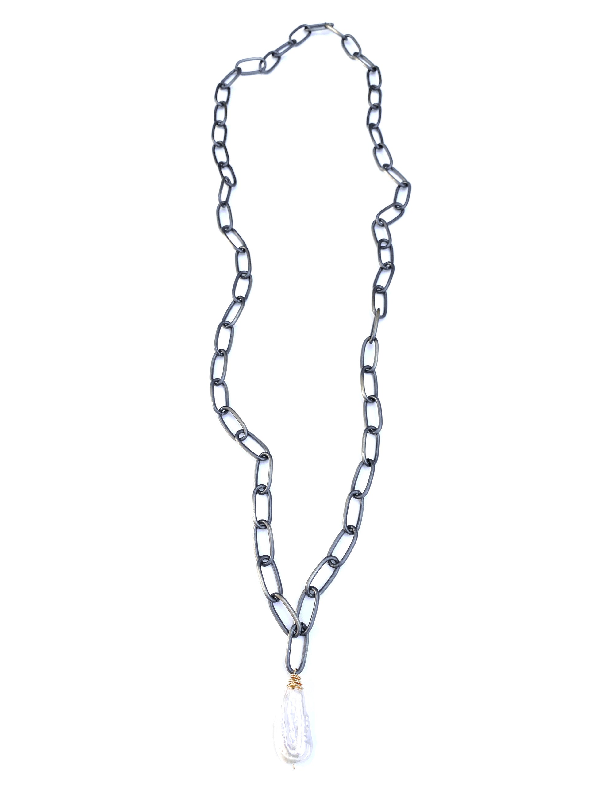 This show stopping necklace has antiqued brass chain with a gorgeous freshwater pearl.