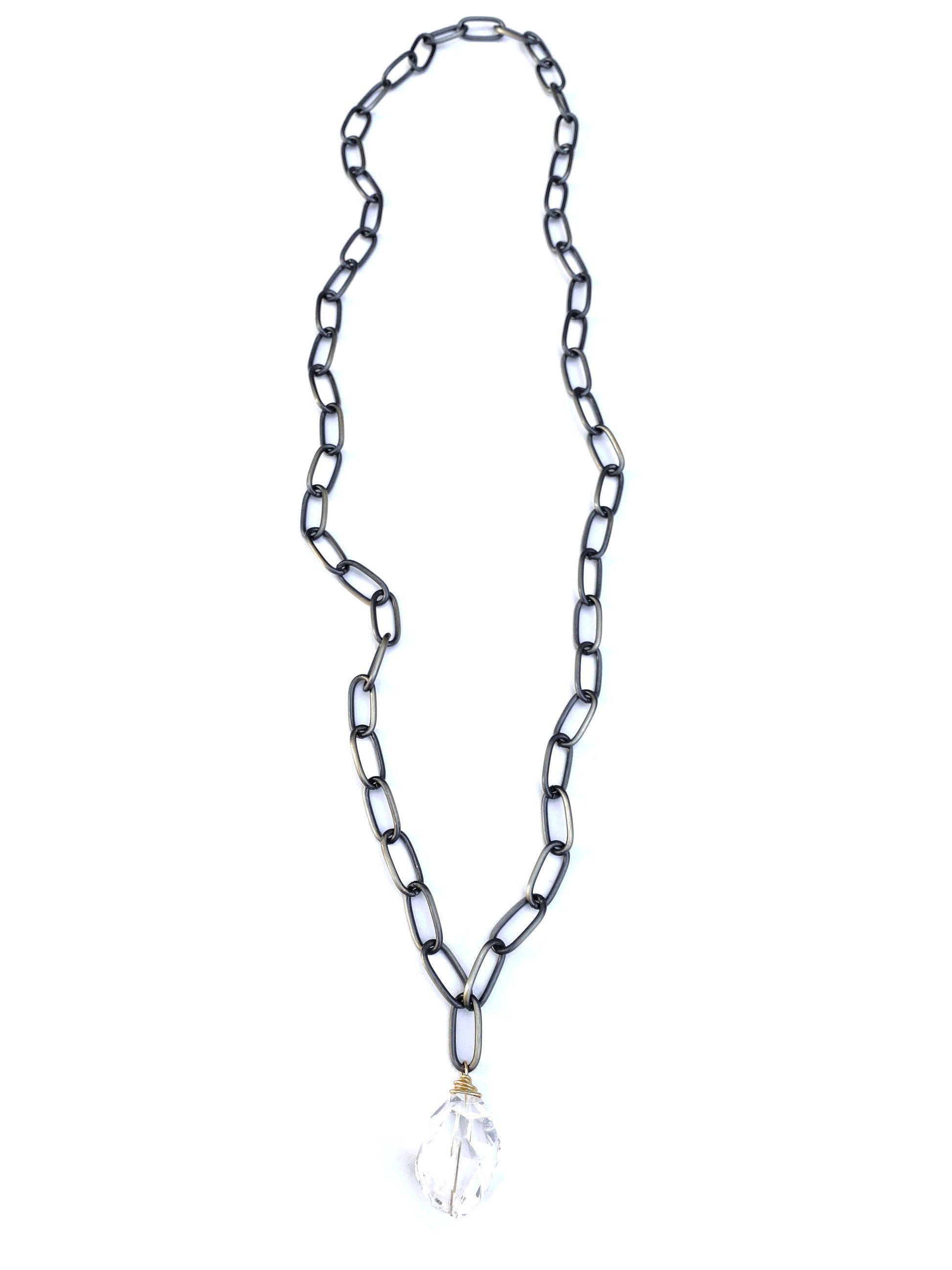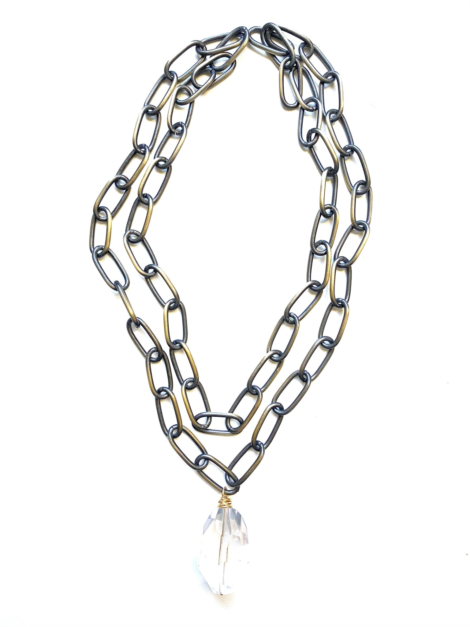 This show stopping necklace has antiqued brass chain with a gorgeous piece of quartz.