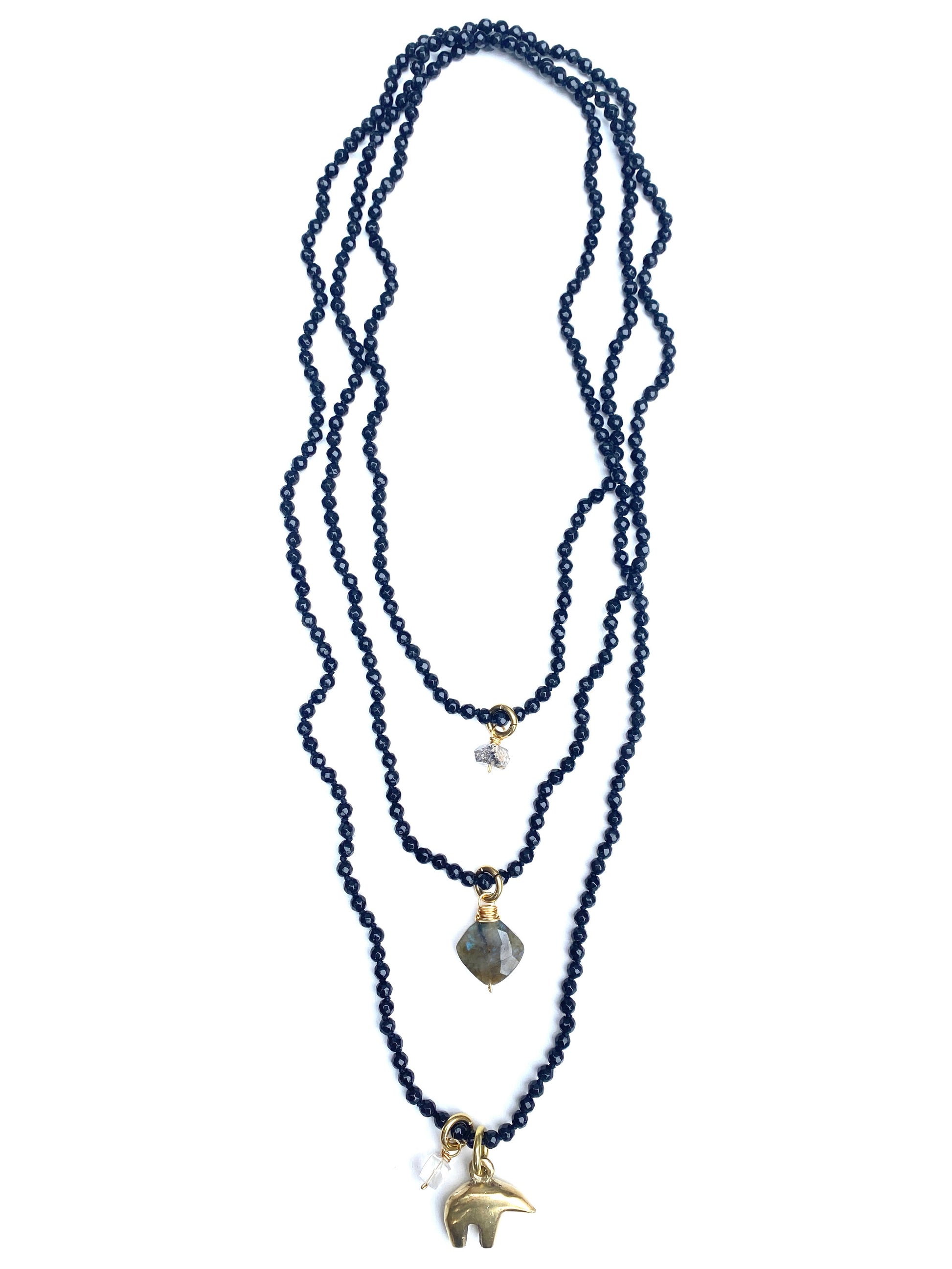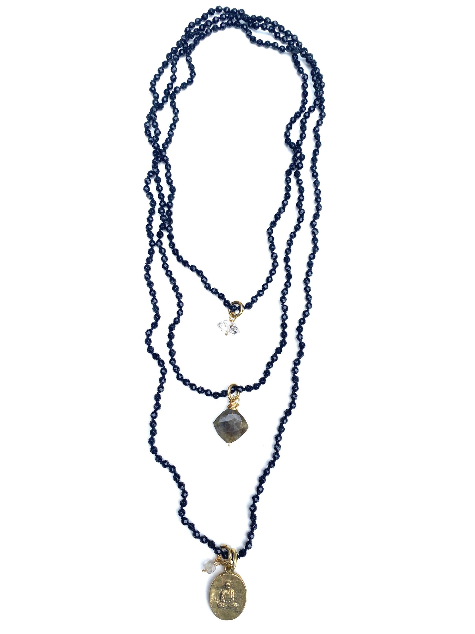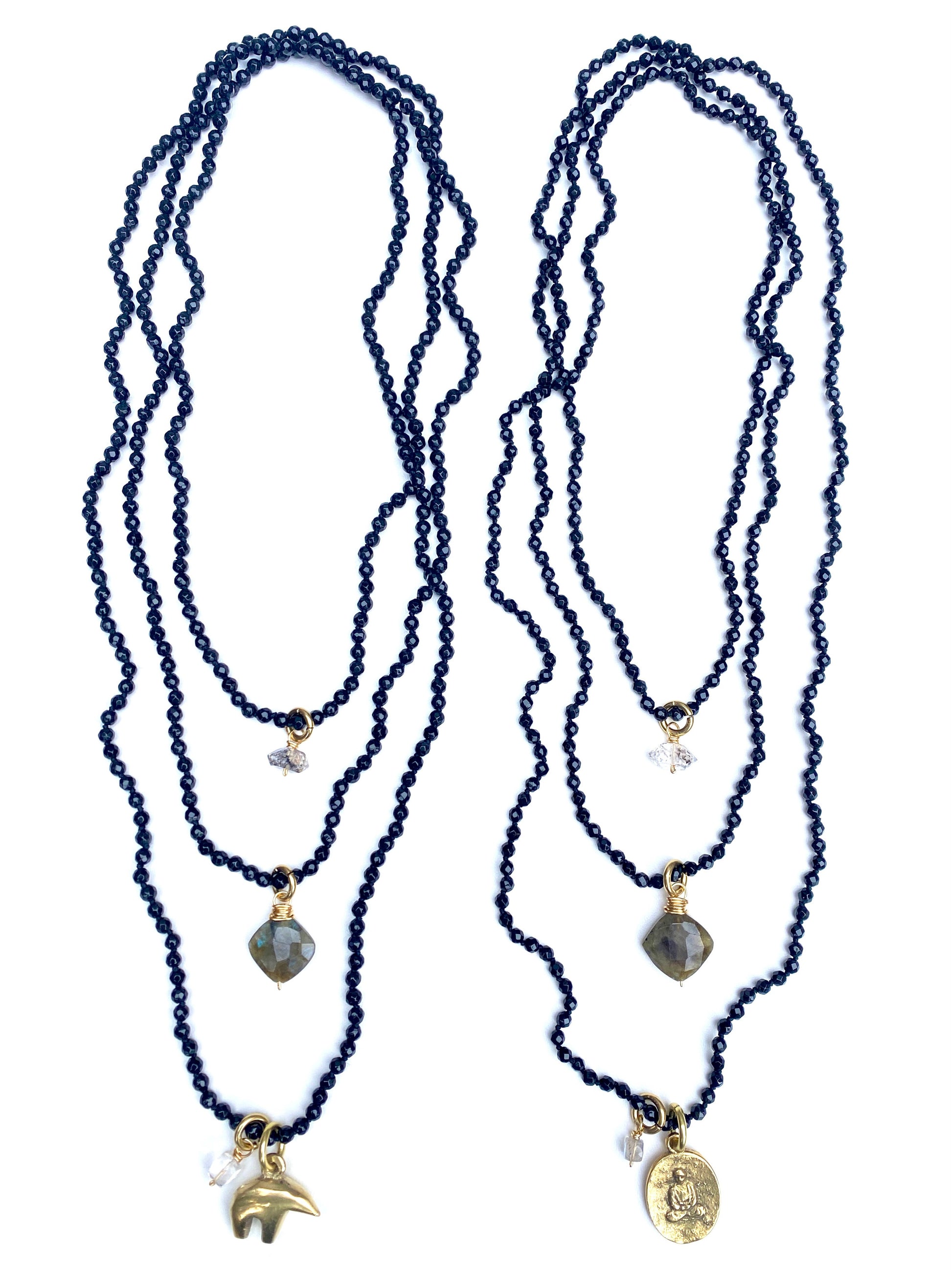 Charms include: herkimer diamond, quartz, labradorite, brass buddha or bear