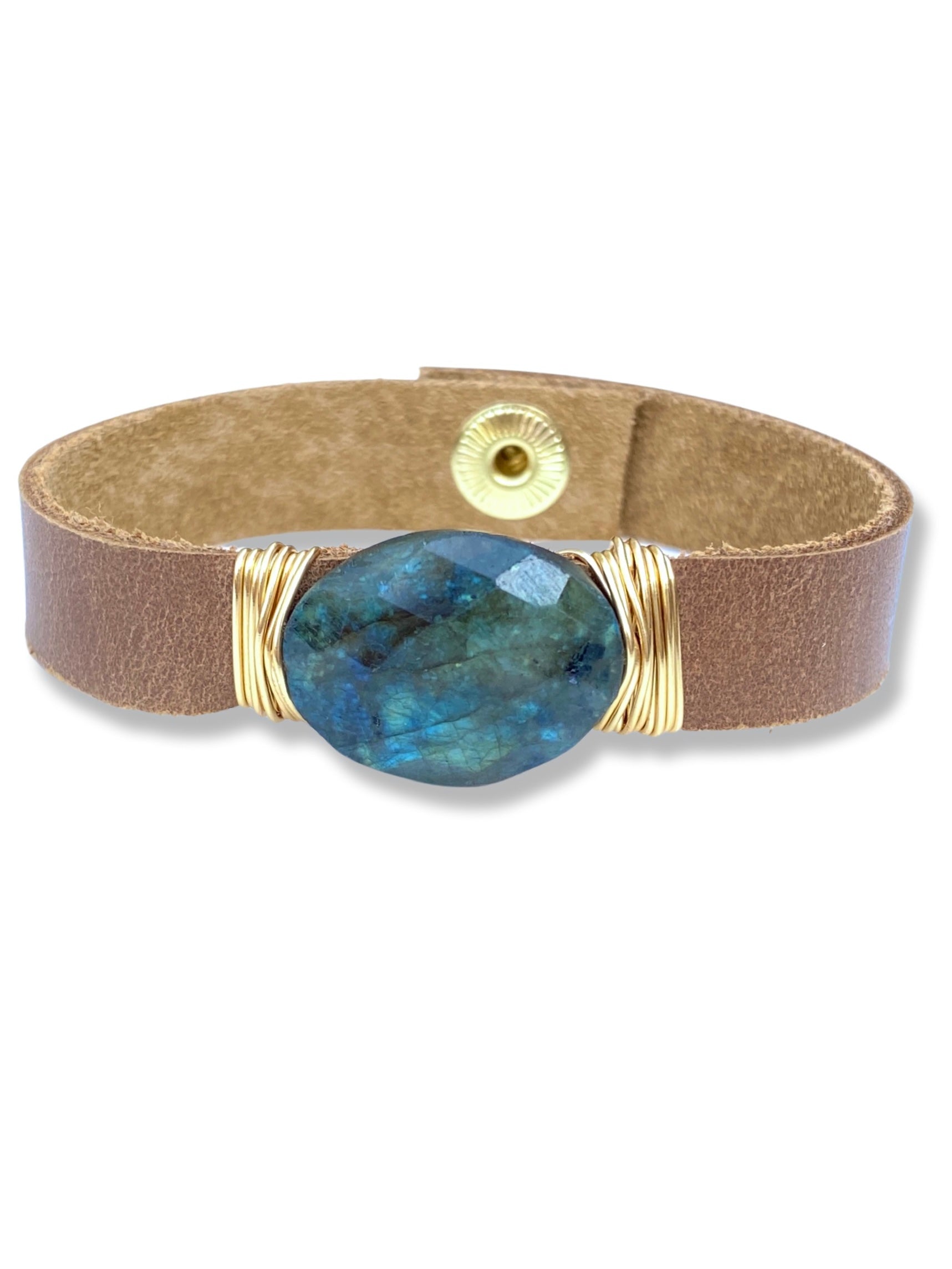 Labradorite wrapped onto caramel brown leather with a snap fastener.