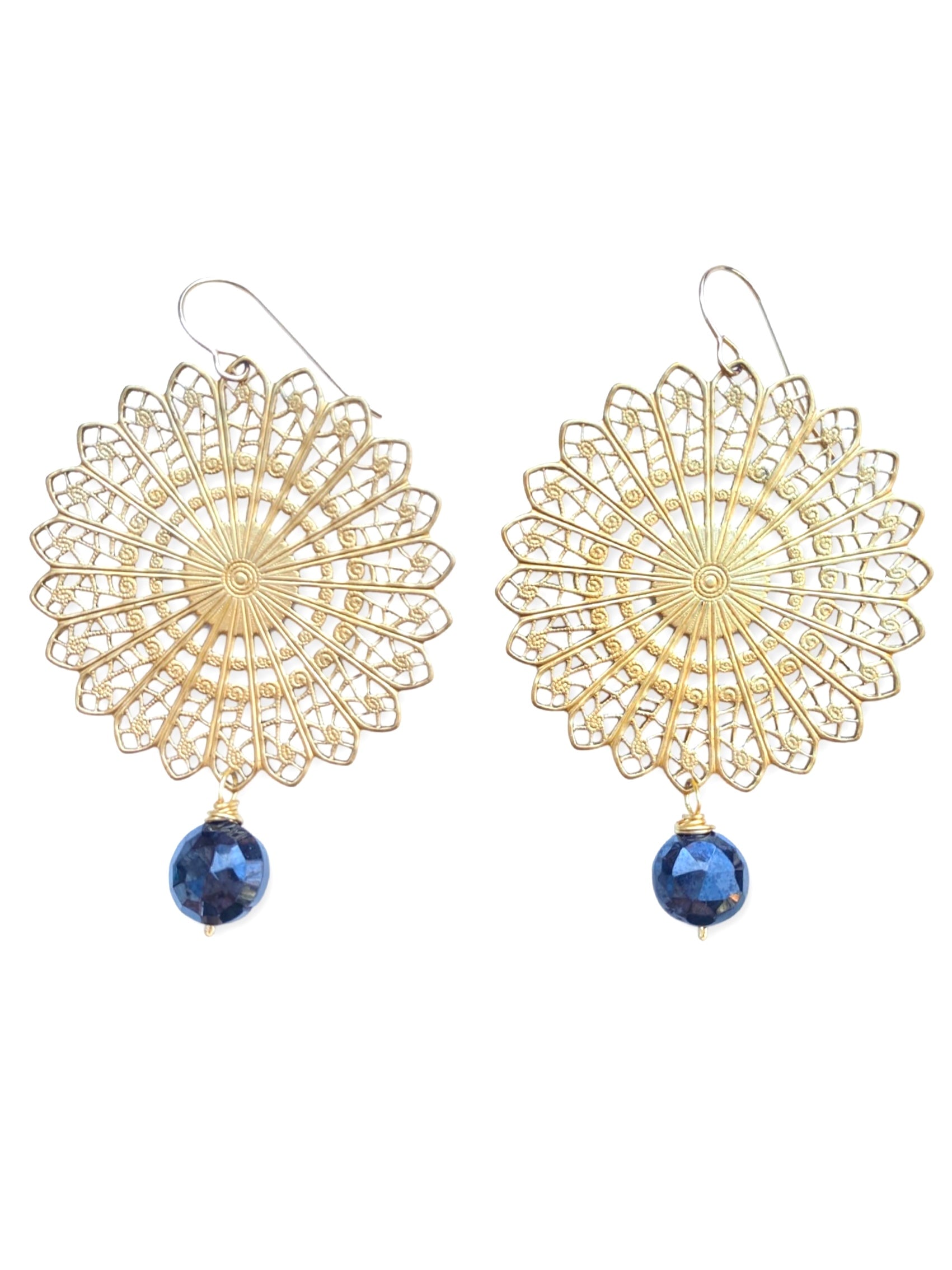Onyx hangs from gold disks making a statement earring that is so light weight that you can wear them all day and night.