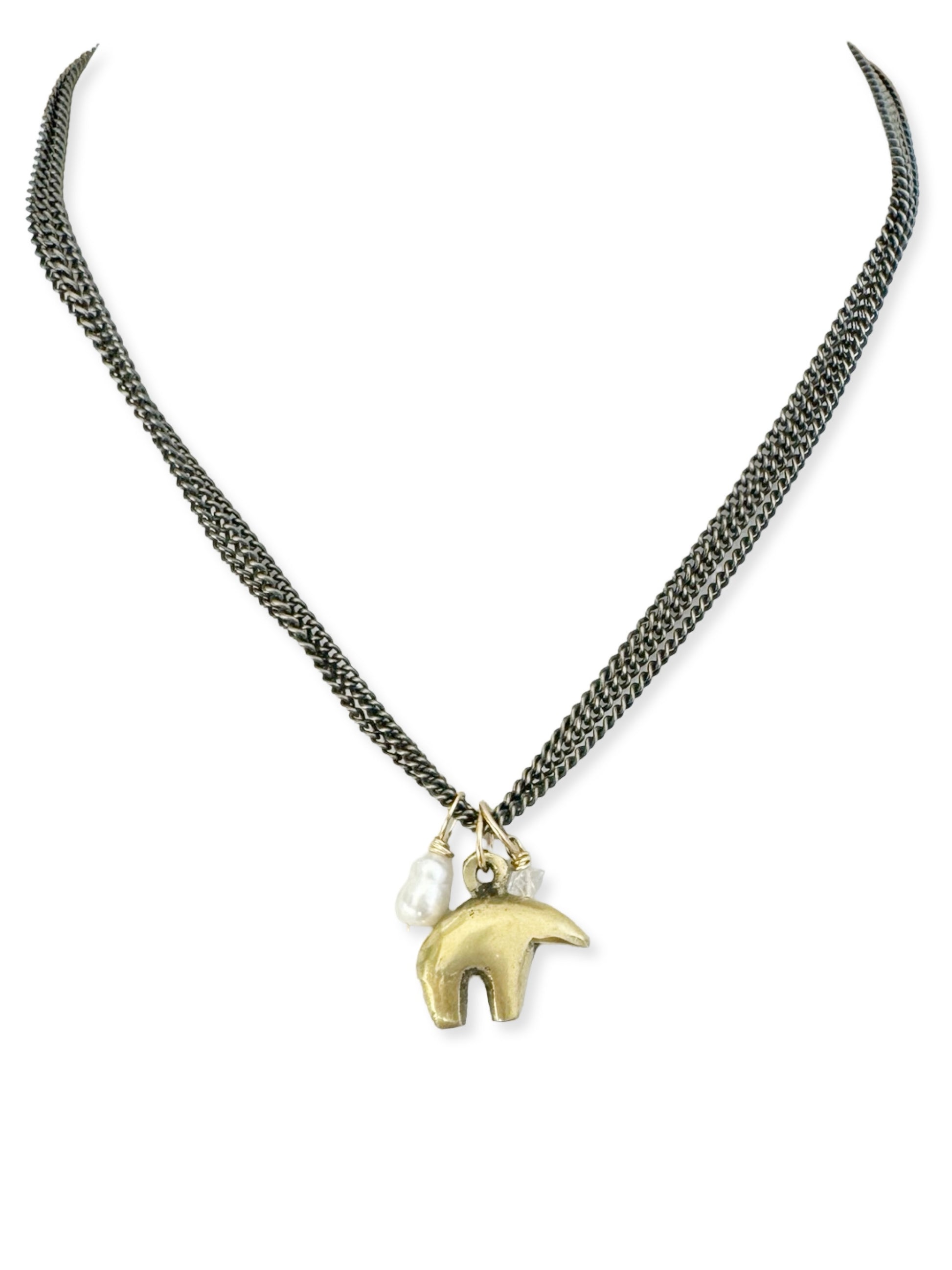 3 antiqued brass chains make up this necklace with a bear pendant. Gold Chain is tarnish resistant brass.