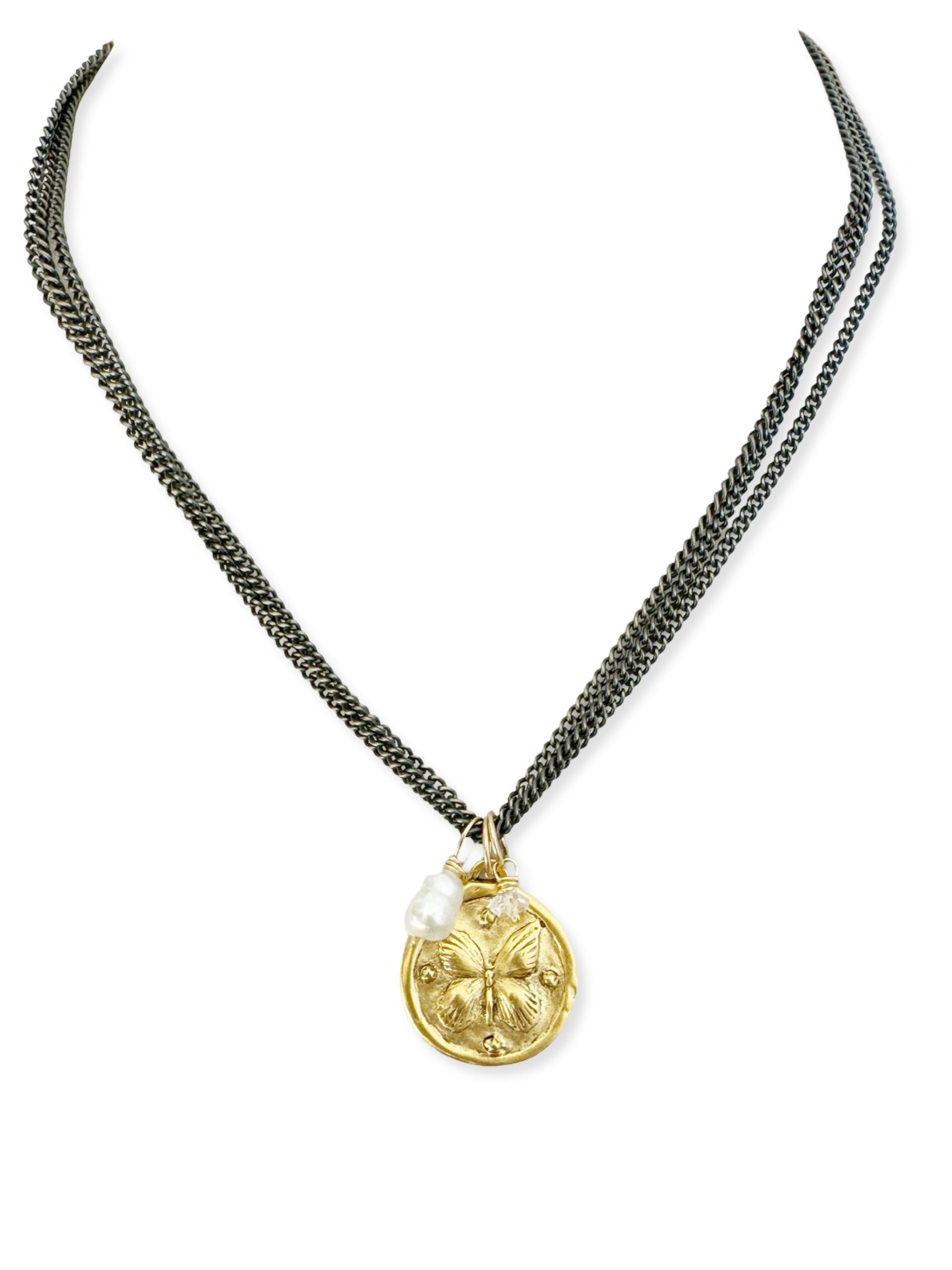3 antiqued brass chains make up this necklace with a butterfly pendant. Gold Chain is tarnish resistant brass.